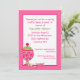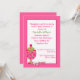 Pretty invitation for a candy buffet baby shower theme. Graphics of a whimsical pink and green candy dish and gaily wrapped candy decorate the left bottom corner of the pink and white invitation. Text in pink and green is ready to personalise for your special event.
