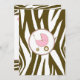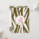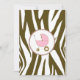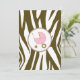An invitation featuring a brown zebra print border across top and bottom with light pink trim. Personalise the brown and pink tango and blackletter font text with details of your event. Opposite side is solid zebra print with a pink baby carriage inside a matching circle shaped frame.