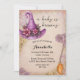 This cute baby shower features a feminine pink Halloween theme that's perfect for a little baby girl. The background is a faded pink parchment paper design with a magical glitter border. A pretty purple witch hat is placed in the top left and accented with flowers and a little cobweb. A broomstick is pictured on the right. The phrase "a baby is brewing" is printed at the top in an elegant script font.