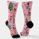 Christmas-themed pattern featuring Santa Claus, reindeer, snowmen, elves, Christmas trees, candy canes, and snowflakes on a pink background