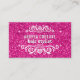 Eye catching, hot pink glitter look beauty salon appointment cards. Suitable for many beauty related businesses such as hairstylists, makeup artists, cosmetologists, fashion stylists, manicurists, beauty consultants, etc. Front has personalised name and title in stylish white lettering with drop shadow effect. Against faux pink glitter background. Framed at top and bottom with an elegant, white scrolls design. Back provides appointment date and time with business contact details in pink and black lettering. Fill in the template with your own beauty business information. Other customisable boutique appointment cards are available in our Zazzle.com/angela65 shop.