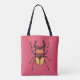 Colourful beetle bag with an artistic vector illustration depicting a stag beetle with big antlers patterned with decorative elements in fun yellow and orange colours over sweet pink background. his entomology design will appeal to someone who loves bugs, insects and wildlife.