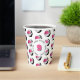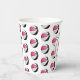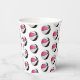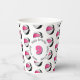 These basketball birthday party paper cups feature multiple small pink, black & white basketballs arranged in a simple drop pattern - text on a white circle graphic can be customised, currently the number 9 to represent a child's age encircled by the words, "Happy birthday" - by katz_d_zynes