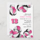 This cute basketball themed party invitation for a birthday or team party features clusters of pink, black and white basketballs at the top and bottom edges on the front and a single cluster covering the back of the invitation - customise the party details on a white background - by katz_d_zynes