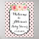 Custom text welcome sign poster for baby shower or birthday party in blush pink and black polka dots pattern with rustic pink and peach watercolor flowers and handwritten style lettering.