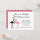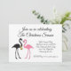 Tropical Christmas party invitations with pink and black flamingos design. Unique coastal party invitations for the holiday season with easy to use text templates in pretty black script. The black flamingo wears a gold ball ornament around his neck and reverse is pink with tiny black Christmas trees.