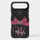 This monogrammed black and grey damask Samsung Galaxy Case-Mate Case has a photo of this design embedded into the hard plastic cover. The design is made up of a black and grey floral damask pattern, a printed pink bow and ribbon, two hearts with diamonds and a black and grey striped pattern bottom portion where you can add your name and monogram initial in gorgeous script fonts. This Samsung case cover is the perfect way to accessorise your phone. Be stylish and girly all at the same time. Design by Elke Clarke©2012. Graphics licensed for use.
