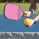 This modern pickleball paddle design with a bright pink background and thin sans serif font personalised name and sporty thin retro stripe pattern near the base on the racket handle in black, a simple and professional pickleball racket.