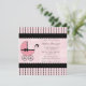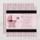 This 5.25x5.25 baby shower party invitation has a black and pink dotted stripes pattern on the top and bottom. There is a black scalloped trim above and below your customisable information in the centre. There are faded flowers and a cute baby stroller in the middle as well.