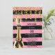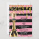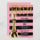 A fun; modern and girly style design featuring pink and black watercolor stripes on which a faux gold bottle of sparkling wine with an exploding cork; sparkling glitter and vertical hanging streamers appear above black and white text templates. These are ideal for women celebrating a special occasion that has a pink and black theme; a milestone or year on year age; special celebration or bridal shower. Personalise the age and wording to suit your event.