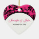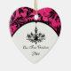 This custom, personalised modern and trendy hot fuchsia pink, black and white ballroom chandelier "Our First Christmas" heart shaped ceramic wedding keepsake ornament has a background pattern of pink and black ornate scrolls on it that would make an ideal house-warming gift for the Newlyweds, a luxury wedding favour, or give it to family and friends who helped make your wedding extra special. The text is customisable. If you require any other matching items, please email your request to niteowlstudio@gmail.com.