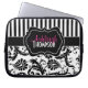 This personalised black and white floral damask laptop sleeve has text boxes for you to customise with your own name, initials, business name, or other text. If you need any help customising, please email niteowlstudio@gmail.com.