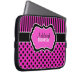 This personalised hot pink, black, and white polka dots and stripes laptop sleeve has text boxes for you to customise with your own name, initials, business name, or other text. If you need any help customising, please email niteowlstudio@gmail.com.