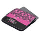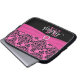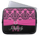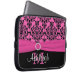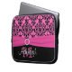This personalised white, black and hot pink damask laptop sleeve with a FAUX ribbon and jewel brooch has text boxes for you to customise with your own name, monograms, business name, or other text. If you need any help customising, please email niteowlstudio@gmail.com.