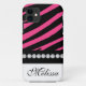 Bold Personalised Pink and Black Zebra Stripe Print iPhone 4 Case-Mate Tough Case. Use this stylish design with a band of faux white diamonds and fancy script font for your name to personalise your iPhone 4 case.