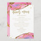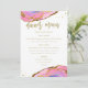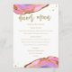 These elegant, modern wedding menu cards feature trendy pink and blue watercolor geode stones with faux gold handwritten script and accents.