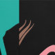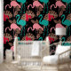 Colourful pattern with flamingos in pink and blue surrounded by tropical plants against black background.