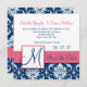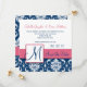 Stylish Wedding Save the Date Cards with Navy Blue and White Damask Pattern, Your Monogram or Initial, Names with Pink accent colours. Wedding Invitation Design by Elke Clarke ©2009. Graphics licensed for use. Customise with your monogram, names and wedding invitation information. Also, choose from a variety of fonts and beautiful papers to make your wedding invitations FABULOUS! Contact us for alterations in colours at luxuryweddinginvitations@gmail.com