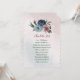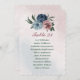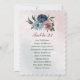 Beautiful botanical wedding seating chart card featuring pink, dusty blue and navy blue flowers with green leaves.