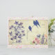 A vintage styled design, with faint pink floral background, and an old postcard decorated with pink and blue wild flowers and blue birds.