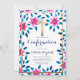 This modern and elegant confirmation invitation is perfect for your child's special day. It features a hand-painted acrylic neon pink, blush pink, coral, and silver flowers with navy blue and aqua blue leaves and faux printed gold foil cross and border on top of a simple white background with ornate cursive typography. It's a pretty, country, sweet, and beautiful design; perfect for any formal, outdoor, backyard, or even casual event.