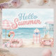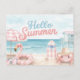 Celebrate the season with this charming Hello Summer beach postcard, featuring a soft watercolor coastal scene in dreamy shades of blush pink and ocean blue. This whimsical design includes a seaside lifeguard stand, gingham surfboard, flamingo float, and an adorable crab in a sun hat—capturing the playful spirit of summer days by the shore.