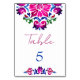 Pink blue Spanish Mexican Talavera tiles wedding table numbers card template with guests names on reverse side , bold colourful save the date card whimsical tile pattern