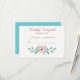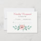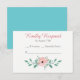 This is a bright and colourful floral wedding RSVP that matches invitations in our store. It features a boho style floral image in pink, blue, and green. Your custom text at the top is in soft grey and matching rose pink. The text and the floral image are placed on a white background. The back of the card is matching blue.