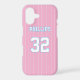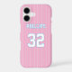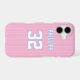 Add a name and number(s) to personalise this custom white pinstripes, pink, and azure blue sports jersey inspired phone case. It is an excellent gift for a sports fan or athlete.