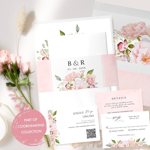 Pink, Blush, Burgundy Floral Wedding Tear Off RSVP All In One Invitation