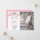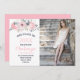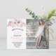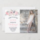 This feminine graduation party invitation has a charming floral design featuring pink and peach flowers, small berries, and soft green leaves arranged at the top. The left side of the postcard includes text displayed in an elegant mix of fonts: sophisticated serif styles, graceful cursive scripts, and clean sans-serif fonts. The text is designed in harmonious colours like black, pink, and peach. The right side of the postcard is reserved for a personal photo. The postcard combines soft tones and thoughtful design to create a delicate, personalised aesthetic.