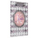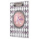 A stylish white and shimmery pink blush harlequin diamond pattern as a backdrop with a pink sphere in the middle with grey flourish for personalising to make it uniquely your own. Elegant chic vibes.