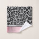 An exotic silver and black faux fur leopard print towel set with a pink blush metallic brushed sheen on the borders of the towels for contrast. Glam animal chic vibes.