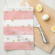 A kitchen towel with an elegant pattern. Featuring pink blush coloured horizontal stripes and faux gold confetti glitter scattered around.