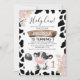 Cute cow themed first birthday invitation for a baby girl featuring a cute black and white cow, cow print pattern and some lovely pink bohemian floral arrangements. This design also features a removable faux gold glitter number. This invitation design is a cute way to invite guests to a holy cow themed girl's first birthday party.