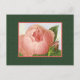 A vintage botanical pink rose blooming against a cream and sky blue background inside a pink frame on a rustic hunter green faux canvas background. The reverse has a small pink rosebud in the corner and an editable return address or message in green script letters.