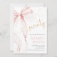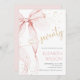 Pink Bow 70th birthday invitation. Modern feminine design in blush pink and gold. Features trendy watercolor coquette bow, and heart script font "seventy". Perfect for an elegant style women's bday celebration. Personalize with your own details. Printed Zazzle invitations or instant download digital printable template.