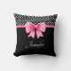 Personalised name print throw pillow with a pink ribbon on a black nd white polka dots pattern. To personalise type your name in the template field. Matching home decor available at the Dots & Stripes Pattern Store.