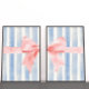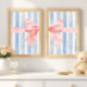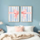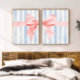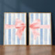 Elevate your space with these unique digital prints with a pink coquette bow split in half against blue watercolor stripes. Perfect for infusing your preppy apartment, girl's bedroom or college dorm room with a fun girly vibes. This one-of-a-kind decor piece is a must-have for those seeking to add a pretty ambiance to their girly wall art collection.