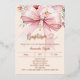 A soft cream, peach colored background, decorated with a pink large bow and, a golden cross and pink flowers. Personalize and add a name and details details. Real rose gold foil text.