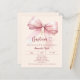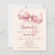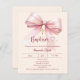 A soft cream, peach colored background, decorated with a pink large bow and, a golden cross. Personalize and add a name and details details.