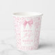 This sweet baby shower paper cup features a soft pastel pink palette and a delicate coquette-inspired bow that creates an elegant focal point. The design is surrounded by whimsical line illustrations of birds, wildflowers, butterflies and tiny ribbons, giving it a romantic storybook garden feel that aligns beautifully with popular vintage and French-inspired baby shower trends.
