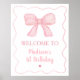Welcome your birthday guests with an adorable personalised welcome sign. Frame the sign and display it on a table near the entrance or mount the poster on foam and display it outside on an easel. The design features a hand painted pink watercolor bow with a squiggle border.
