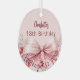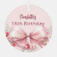 A blush pink background. Decorated with a large pink bow and pink flowers. Personalise and add a name, age and birthday date. The name is andwritten style script.