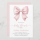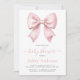 On the front, in the upper part, above all text, it has pink bow in watercolor. Under it there is the text: the words "baby shower" and are written in a pink handwriting script, the name in pink letters, the rest in smaller black caps.