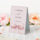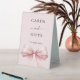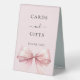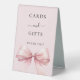 A soft blush pink background, decorated with a large pink bow. Text: Cards and Gifts. Thank you!