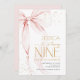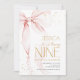 Pink bow girl's 9th birthday invitation. Modern feminine design in blush pink and gold. Features trendy watercolor coquette bow, calligraphy heart script font and modern typography NINE. Perfect for an elegant style girl's fifth bday celebration. Personalize with your own details. Printed Zazzle invitations or instant download digital printable template.