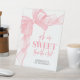 Girls Are Sweet Please Take A Treat Tabletop Sign. This adorable sign features a playful watercolor bow with a ribbon frame accenting the top and left side, adding a sweet and stylish touch to your setup. The phrase “Girls Are Sweet Please Take A Treat” is displayed prominently in a mix of fun handwritten script and classic serif fonts, creating a charming and playful look.