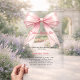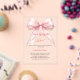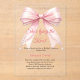A clear, transparent background, decorated with a pink colored bow with pearls. Personalize and add a name and party details.