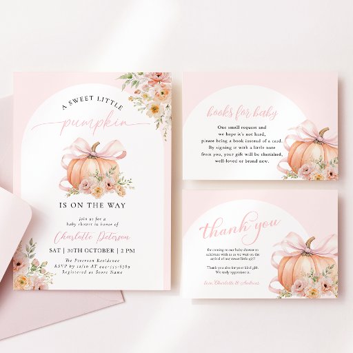 This elegant and charming baby shower invitation features a beautiful watercolor illustration of pumpkins with a delicate pink ribbon and floral details, perfect for celebrating the upcoming arrival of a little one in the fall season.